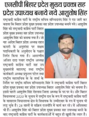 बिहार प्रदेश मुख्य प्रवक्ता सह प्रदेश उपाध्यक्ष एनसीपी बने आशुतोष सिंह,दिल्ली राष्ट्रीय सचिव सच्चिदानंद सिंह ने की घोषणा