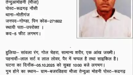 मोतीगंज थाना क्षेत्र के ग्राम पंचायत तेंदुआ मोहिनी के मजरा बजरडिहवा निवासी 60 वर्षीय दुर्गा प्रसाद 5 अक्टूबर को घर से निकलने के बाद लापता हो गए। परिजनो ने पुलिस को सूचना दी और बेटे की तहरीर पर गुमशुदगी की FIR दर्ज कराई गई है। मंगलवार 5 बजे थानाध्यक्ष ने बताया मामले की गंभीरता से जांच कर रही है और दुर्गा प्रसाद की खोज के लिए विभिन्न टीमों के साथ तलाश जारी है।