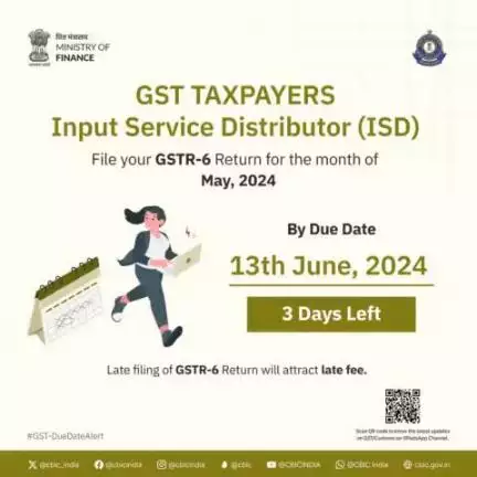 GST TAXPAYERS INPUT SERVICE DISTRIBUTOR ( ISD), File your GSTR-6 Return for the month of May, 2024 by Due Date 13th June 2024