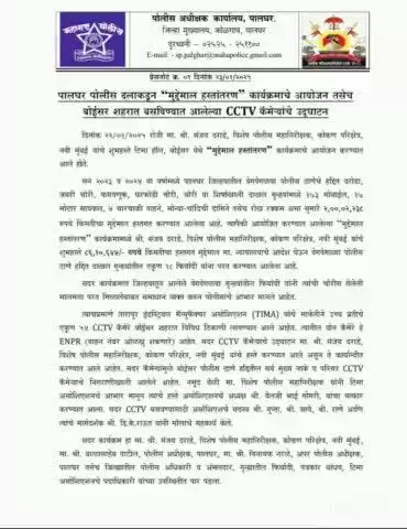 पालघर पोलीस दलाकडून मुद्देमाल हस्तांतरण कार्यक्रमाचे आयोजन तसेच बोईसर शहरात बसविण्यात आलेल्या सीसीटीव्ही कॅमेऱ्याचे उद्घाटन कार्यक्रम पार पडले.
