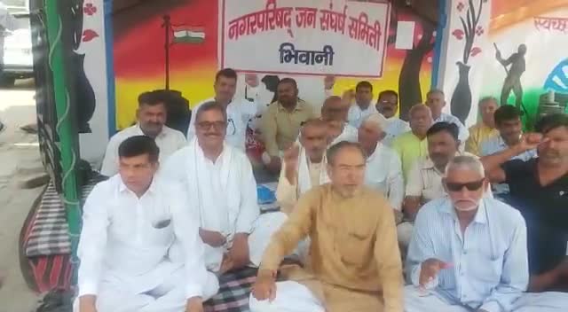 भिवानी नगर परिषद घोटाले की उच्च स्तरीय जांच करने की मांग को लेकर धरने पर बैठे युवा कल्याण संगठन के सदस्य