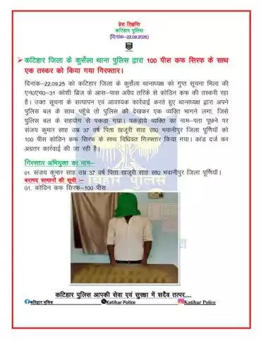 कटिहार जिला के कुर्सेला थाना पुलिस द्वारा 100 पीस कफ सिरफ के साथ एक तस्कर को किया गया गिरफ्तार।