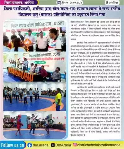 जिलाधिकारी अररिया, श्री अनिल कुमार द्वारा खेल भवन सह व्यायाम शाला में राज्य स्तरीय विद्यालय वुशु ( बालक) प्रतियोगिता 2024 का उद्घाटन किया गया।