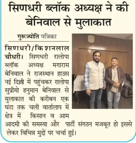 ब्लॉक अध्यक्ष ने कि रालोपा सुप्रीमो हनुमान बेनिवाल से मुलाकात