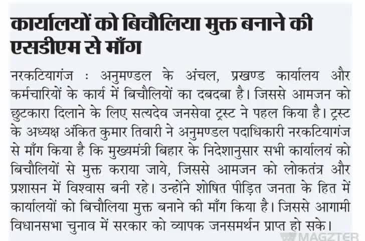 नरकटियागंज अंचल कार्यालय परिसर एवं कर्मचारी ऑफिस को बिचौलिया मुक्त बनाने की एसडीएम सर नरकटियागंज से किया मांग। - सत्यदेव जनसेवा ट्रस्ट