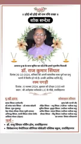 डॉ राजकुमार सिंघल का देहांत 26 अक्टूबर 2024 को हुआ रसम पगड़ी 6 नवंबर 2024 कोबस स्टैंड स्थित रोड वंश धर्मशाला में होगी।