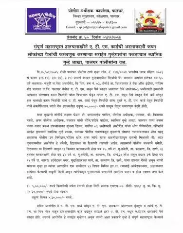 संपूर्ण महाराष्ट्रात ATM कार्डची अदलाबदल करून फसवणूक करणाऱ्या सराईत गुन्हेगारांना पालघर पोलिसांकडून अटक.