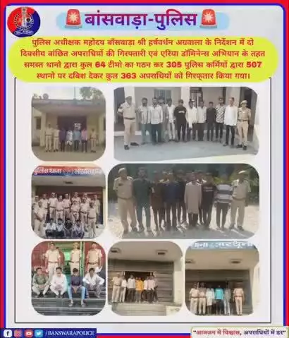 दो दिवसीय वांछित अपराधियों की गिरफ्तारी एवं एरिया डॉमिनेन्स अभियान के तहत समस्त थानो द्वारा कुल 64 टीमो का गठन कर 305 पुलिस कर्मियों द्वारा 507 स्थानो पर दबिश देकर कुल 363 आरोपियों को किया गिरफ्तार।