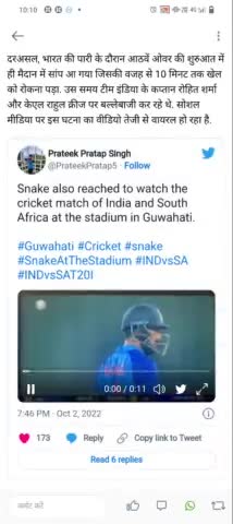 ind/sa gowahati me khele ja rahe match ke bich ground me phuncha bishalkay sanp 10 minat tak khel Raha badhit#indsat20