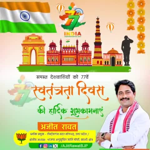 भाजपा अजा.मोर्चा काशी क्षेत्र के अध्यक्ष एवं सदर ब्लॉक प्रमुख रॉबर्ट्सगंज श्री अजीत रावत ने स्वतंत्रता दिवस की बाधाई दी।