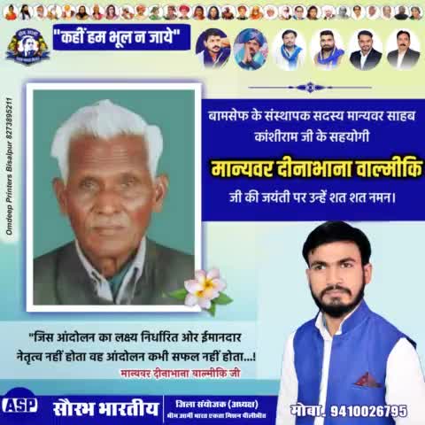 मान्यवर कांशीराम जी के सहयोगी व बामसेफ के संस्थापक सदस्य,मान्यवर दीनाभाना वाल्मीकि जी की जयंती पर उन्हें शत-शत नमन।