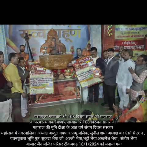 परमपूज्य गणाचार्य श्री 108 विराग सागर जी महाराज के परमप्रभावक शिष्य उपाध्याय श्री विरंजन सागर जी महाराज की मूनि दीक्षा के आठ वर्ष संयम दिवस संस्कार महोत्सव मे नगरपालिका अध्यक्ष अब्दुल गफ्फार पप्पू मलिक, सुनील शर्मा पवनघुवारा भी उपस्थित रहे