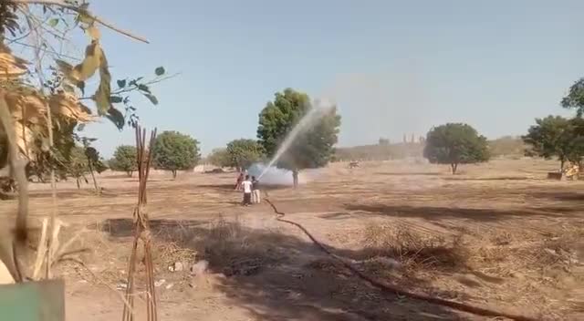 मुख्यमंत्री अशोक गहलोत के जोधपुर आगमन से पहले सभा स्थल पर पानी का छिड़काव करते हुए दमकल कर्मी।