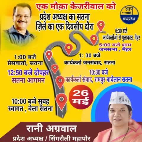 आम आदमी पार्टी की प्रदेश अध्यक्ष एवं महापौर सिंगरौली श्रीमती रानी अग्रवाल जी के 3 दिवसीय कार्यक्रम का रूट चार्ट । 24 ,25