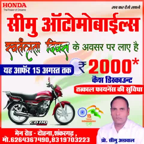 सीमु ऑटोमोबाइल्स होंडा द्वारा स्वतंत्रता दिवस के अवसर पर लाए है 2000 रूपये तक का नगद छूट ऑफर 12 अगस्त से 15 अगस्त तक