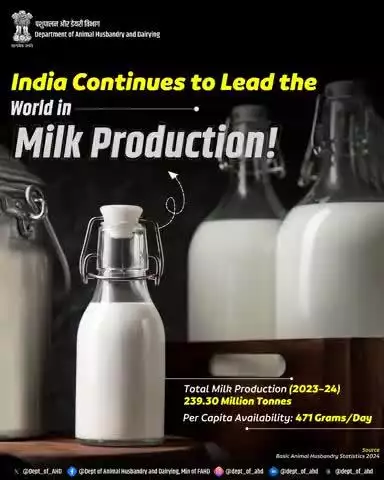 India Leads the World in Milk Production! With an impressive 239.50 million tonnes of milk produced in 2023–24 and a per capita availability of 471 grams/day, India continues to top the global charts in dairy production. #MilkProduction #