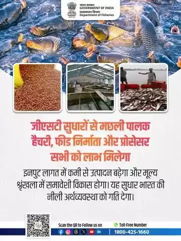 मत्स्य वैल्यू चेन के सभी चरण दिखाएं—हैचरी, फीड मिल, तालाब, प्रोसेसिंग यूनिट और निर्यात। #NextGenGST #Fisheries #Aquaculture