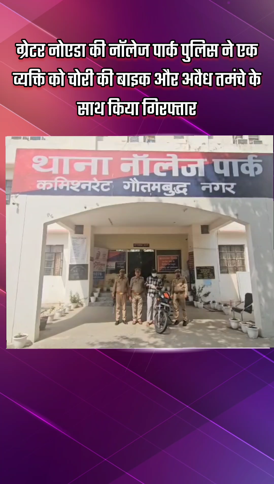 ग्रेटर नोएडा की नॉलेज पार्क पुलिस ने एक व्यक्ति को चोरी की बाइक और अवैध तमंचे के साथ किया गिरफ्तार।