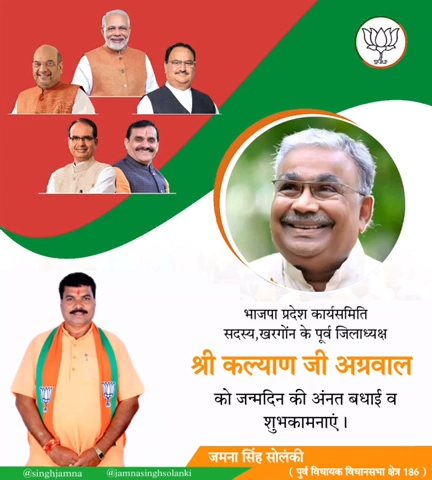 भाजपा प्रदेश कार्यसमिति सदस्य,खरगोंन के पूर्व जिलाध्यक्ष श्री कल्याण जी अग्रवाल को जन्मदिन की अंनत बधाई व शुभकामनाएं।@agrawal_kalyan