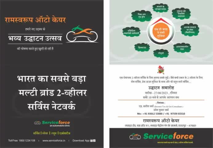 रामस्वरूप ऑटो केयर उदघाटन समारोह 27.8.2023 को बस स्टैंड आप सभी लोगों को अमंत्रित करते हैं एक बार सेवा का मौका जरूर दे, अयोजक सतीश वर्मा जी (आयकर जीएसटी सलाहकार)
