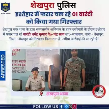 शेखपुरा थाना के द्वारा समकालीन अभियान के तहत छापेमारी के दौरान इश्तेहार में फरार चल रहे 01 वारंटी गिरफ्तार....