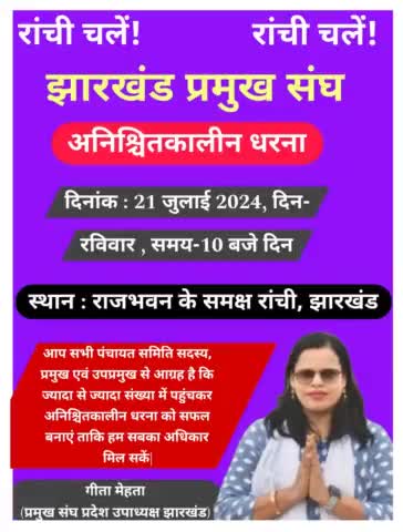 21/07//2024 को झारखण्ड के सभी प्रमुख उपप्रमुख पंचायत समिति सदस्य पंचायत राज्य अधिनियम 2001के अधिन अपने हक अधिकार के लिए अनिश्चित कालीन धरना प्रदर्शन मे रांची चले।