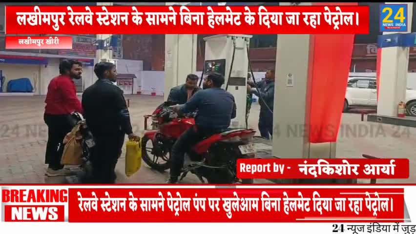 लखीमपुर रेलवे स्टेशन के सामने बिना हेलमेट दिया जा रहा पेट्रोल।