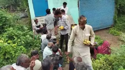 ब्लाक चरखारी ग्राम के जरौली में खाद वितरण के दौरान किसान भाइयों को नाश्ता (केले) वितरण करते अवधेश और आदेश राजपूत