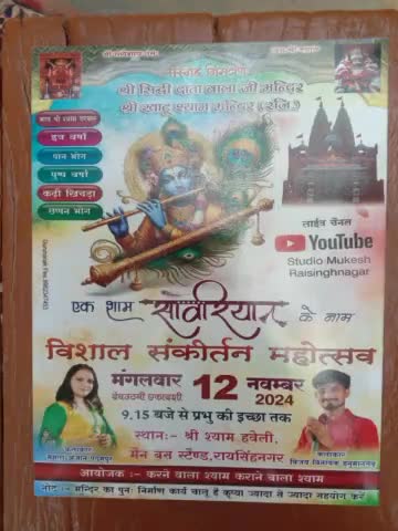 रायसिंहनगर सिद्ध दाता श्री बालाजी मंदिर श्री श्याम हवेली में विशाल सकीर्तन महोत्सव 12 नवंबर 2024 को रात्रि 9:15 बजे होगा