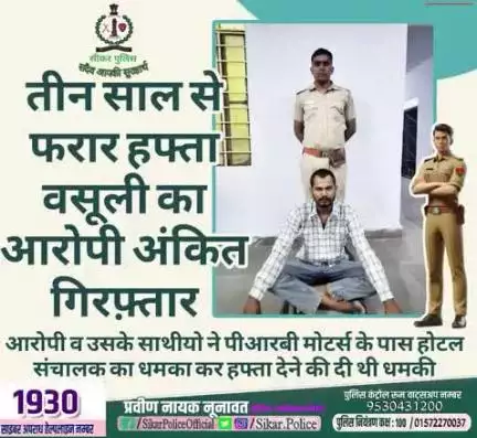 #सीकर 🔸तीन साल से फरार हफ्ता वसूली का आरोपी अंकित गिरफ़्तार ▪️आरोपी व उसके साथीयो ने पीआरबी मोटर्स के पास होटल संचालक का धमका कर हफ्ता देने की दी थी धमकी #थाना_रींगस #TeamSikarPolice