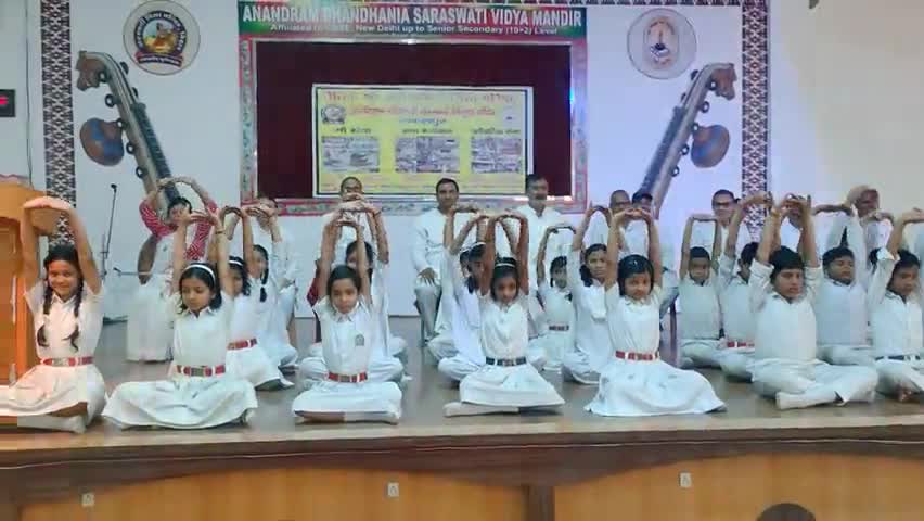 आनन्दराम ढांढनियाँ सरस्वती विद्या मंदिर भागलपुर के केशव सभागार में वंदना के पूर्व योगासन करते हुए भैया -बहन।