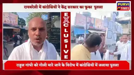 रायबरेली नेता प्रतिपक्ष राहुल गांधी को गोली मारे जाने के विरोध में कांग्रेसियों ने केंद्र सरकार का जलाया पुतला