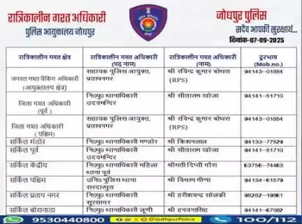 #जोधपुर_पुलिस आयुक्तालय क्षेत्र में निम्न अधिकारियों की #रात्रिकालीन_गश्त 12 AM से 05 AM तक रहेगी। रात्रि में किसी प्रकार की सहायता के लिए निम्न अधिकारियो से संपर्क कर सकते हैं। आपकी सुरक्षा हमारी प्राथमिकता है।