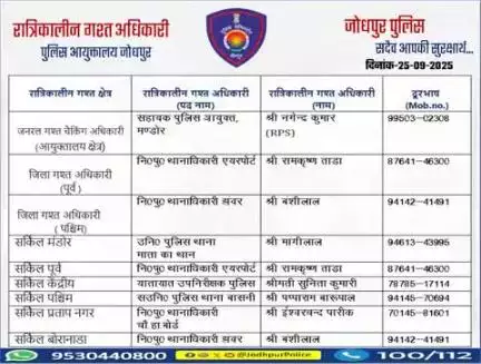 #जोधपुर_पुलिस आयुक्तालय क्षेत्र में निम्न अधिकारियों की #रात्रिकालीन_गश्त 12 AM से 05 AM तक रहेगी। रात्रि में किसी प्रकार की सहायता के लिए निम्न अधिकारियो से संपर्क कर सकते हैं। आपकी सुरक्षा हमारी प्राथमिकता है।