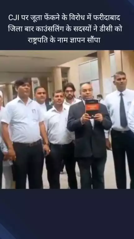 सुप्रीम कोर्ट में सोमवार को सुप्रीम कोर्ट के चीफ जस्टिस (CJI) बीआर गवई पर की तरफ वकील राकेश किशोर द्वारा जूता फेंकने की कोशिश करने को लेकर फरीदाबाद जिला बार काउंसिल के सदस्यों ने डीसी को राष्ट्रपति के नाम ज्ञापन सौंपा। जिसमें उन्होंने वकील की हरकत को गलत ठहराया और बार काउंसिल ऑफ इंडिया से वकील का लाइसेंस रद्द करने कानूनी कार्यवाही करने की मांग की है।