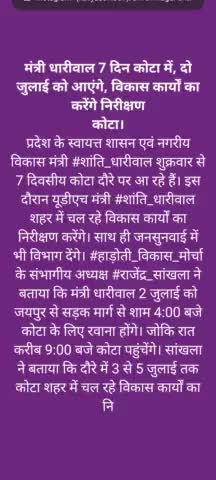 स्वात्य सासन मंत्री शांति धारीवाल 7 दिवसीय दौरे पर पहोचरे है कोटा 4 बजे हुए जयपुर से रवाना 9 बजे तक कोटा पहोच सकते है।
