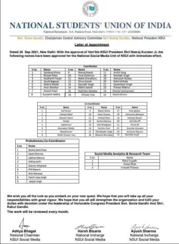 NSUI COMMUNIQUE NSUI National President Shri Neeraj Kundan ji has approved the National Social Media Committee of NSUI with immediate effect.