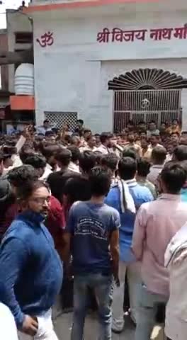 छिबरामऊ : मन्दिर में हुई तोड़फोड़ के बाद मंदिर के बाहर उमड़ी भीड़।