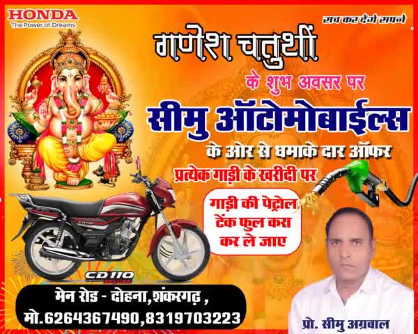गणेश चतुर्थी के शुभ अवसर पर सीमु ऑटोमोबाइल्स हौंडा द्वारा प्रत्येक गाड़ी की खरीदी पर पेट्रोल टैंक फुल कर के दिया जा रहा है