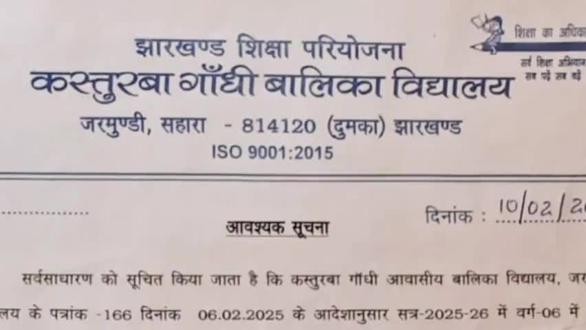 कस्तूरबा गाँधी बालिका विद्यालय जरमुंडी में सत्र 2025-26 के वर्ग षष्ठ में नामांकन हेतु आवेदन पत्र आमंत्रित।