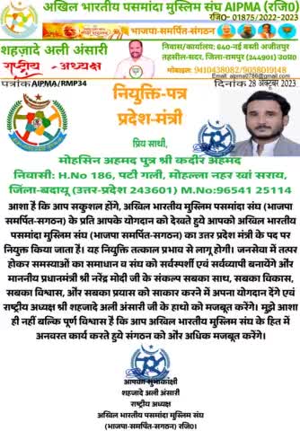अखिल भारतीय पसमांदा मुस्लिम संघ (भाजपा-समर्पित-संगठन) के राष्ट्रीय अध्यक्ष एवं कार्यवाहक प्रदेशाध्यक्ष शहज़ादे अली अंसारी ने जनपद-बदायूं निवासी मोहसिन अहमद को उत्तर प्रदेश के प्रदेश-मंत्री पद पर नियुक्त किया है।