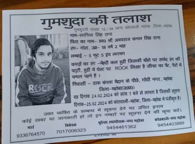 सानिध्य सिंह राणा पुत्र स्वर्गीय श्री अवध राजकमल नरसिंह राणा 24/02/2024 शाम 5 बजे से लापता हैं आप सभी से निवेदन है कि यथा संभव उक्त जानकारी को अधिक से अधिक लोगों की जानकारी में लाएं जिससे सानिध्य सिंह राणा की जानकारी प्राप्त की जाए