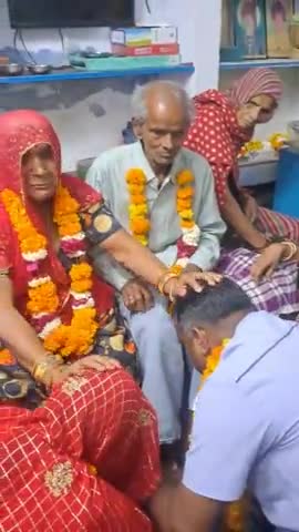 प्रयागराज महाकुम्भ से आने पर माता पिता के चरणों को सनान कराते हुए अमरचंद ललिता चौहान पाली