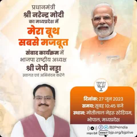 नमस्कार, सूचनार्थ! मा. प्रधानमंत्री जी दिनांक 27 जून को सुबह 10:30 बजे कार्यकर्ताओ के साथ वर्चुअल संवाद करेंगे। कार्यक्रम के लाइव प्रसारण का लिंक- tinyurl.com/yr9ppfsy मिस्डकॉल न० 9090902024 , कार्यक्रम के फोटो अपलोड करने का लिंक - http