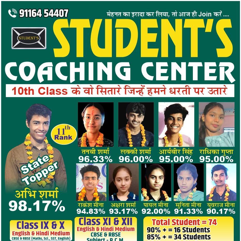 स्टूडेंट कोचिंग सेंटर दौसा के आगर रोड पर स्थित है जहां कक्षा 9 से 12वीं तक की पढ़ाई उत्कृष्ट शिक्षको द्वारा संस्था के निदेशक रणवीर सिंह चौहान के नेतृत्व में कराई जाती है।