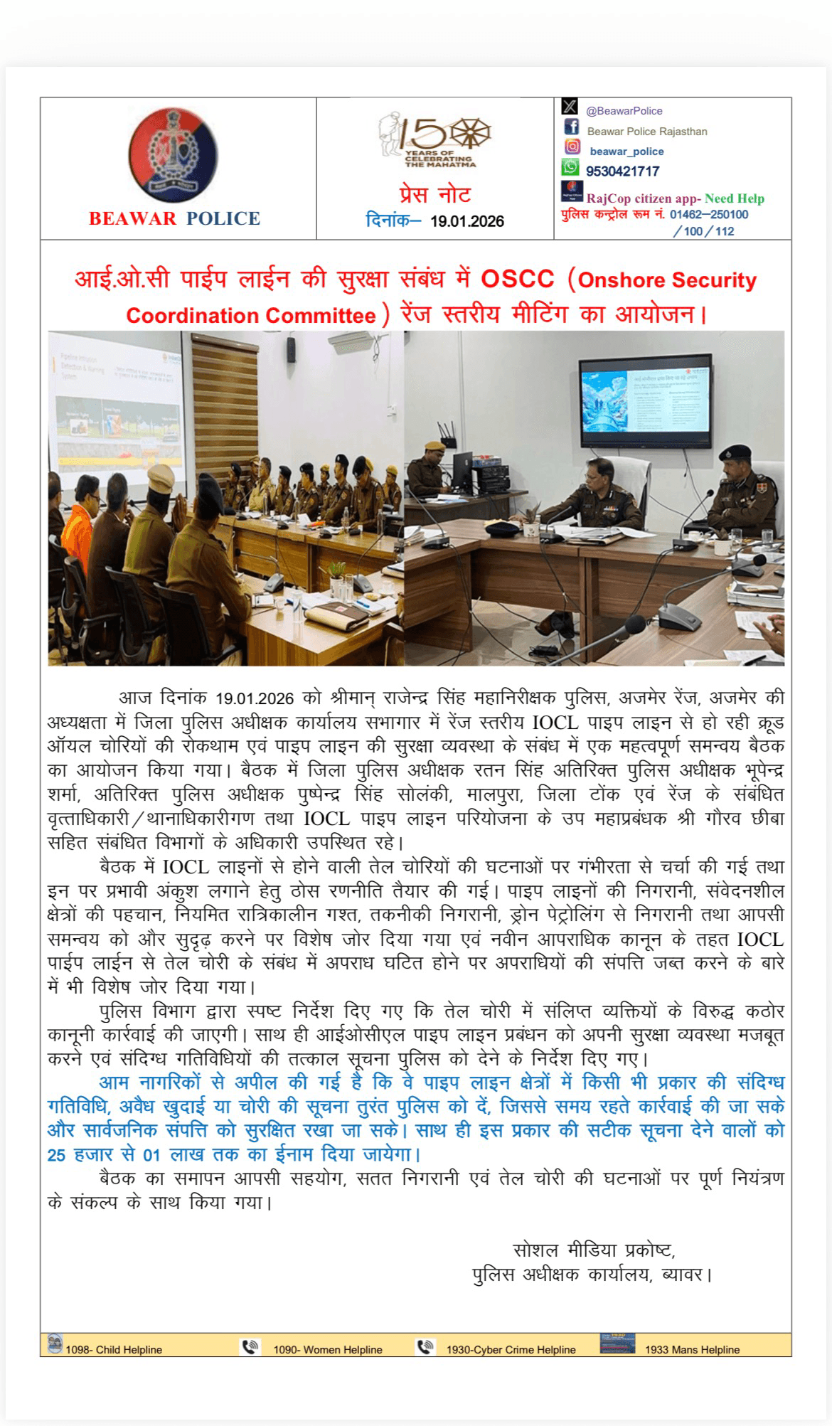 जिला पुलिस अधीक्षक कार्यालय सभागार में श्रीमान राजेंद्र सिंह महानिरीक्षक पुलिस अजमेर रेंज अजमेर की अध्यक्षता में IOCL पाइपलाइन की सुरक्षा संबंध में OSCC की रेंज स्तरीय बैठक का आयोजन - Ajmer News