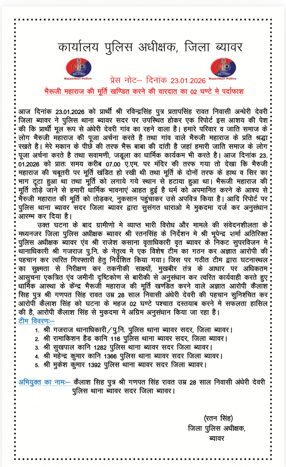 पुलिस थाना ब्यावर सदर ने किया मूर्ति खंडित करने की घटना का खुलासा, 1 आरोपी गिरफ्तार