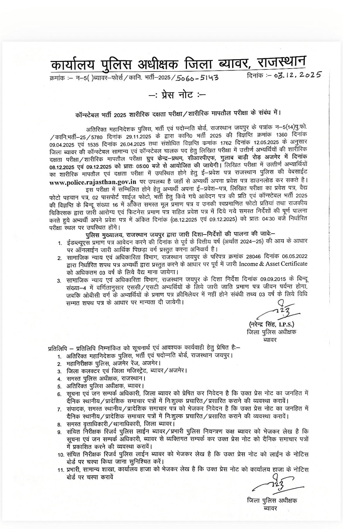 जिला ब्यावर के पुलिस कांस्टेबल भर्ती परीक्षा 2025 शारीरिक दक्षता परीक्षा का दिनांक 8 व 9 दिसंबर 2025 को आयोजित