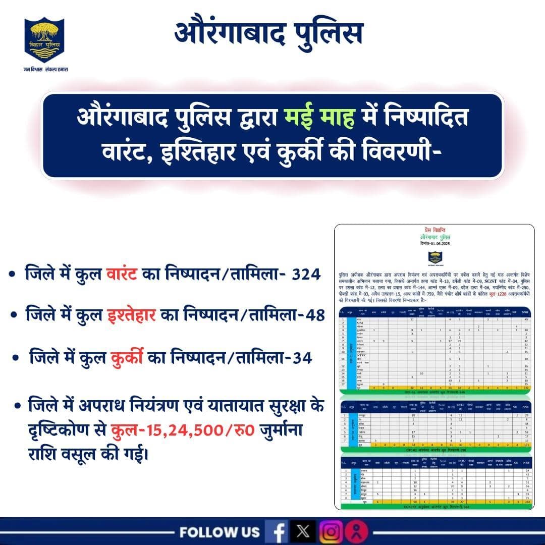औरंगाबाद पुलिस द्वारा मई माह में निष्पादित वारंट, इश्तेहार एवं कुर्की की विवरणी . . #औरंगाबाद_पुलिस #HainTaiyarHum