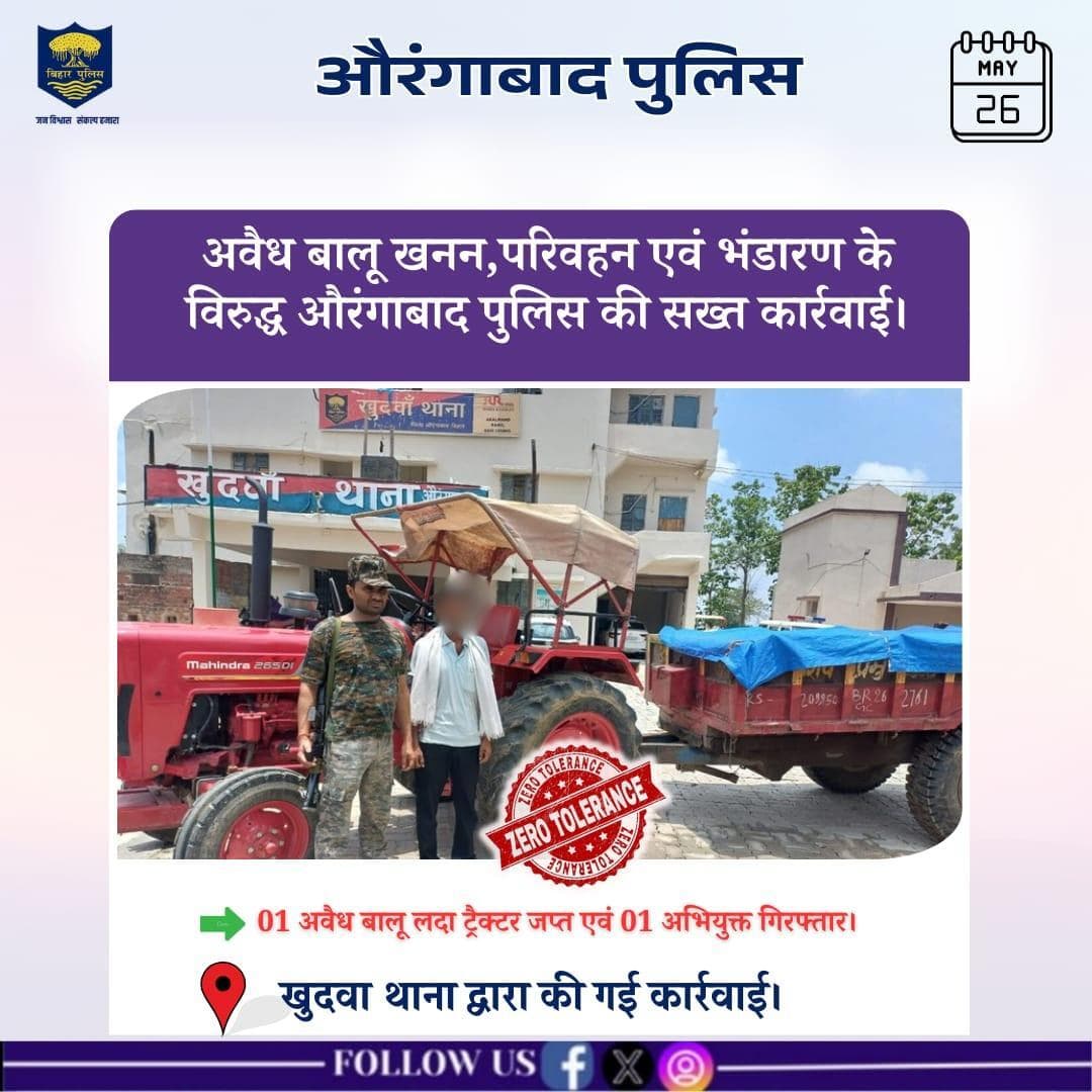 खुदवा थानांतर्गत से अवैध बालू लदे 01 ट्रैक्टर को जप्त कर 01 अभियुक्त को औरंगाबाद पुलिस ने किया गिरफ्तार।